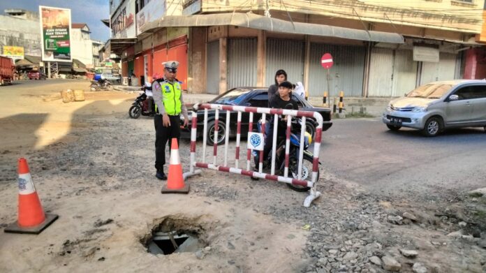 Dijelaskan kasat, lubang berdiamater sekitar 1 meter tersebut diakibatkan amblasnya gorong gorong saluran air yang belum lama ini di perbaiki dan masih dalam tahap uji coba sebelum dilakukan pengaspalan.