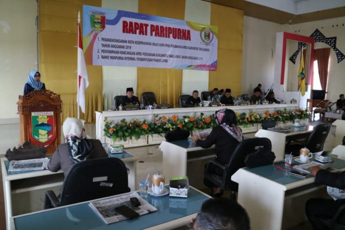 Tanggamus, PC – Bupati Tanggamus Hj. Dewi Handajani didampingi Wakil Bupati Hi. AM. Syafi’i bersama Pimpinan DPRD Tanggamus Ketua Heri Agus Setiawan, bersama para Wakil Ketua I Rusli Shoheh, Wakil Ketua II Aris Budianto dan Wakil Ketua III Sunu Jatmiko, menandatangani Nota Kesepahaman Kebijakan Umum Perubahan Anggaran dan Prioritas Plafon Anggaran Sementara (KUPA-PPAS) Perubahan APBD Kabupaten Tanggamus Tahun 2019, di ruang sidang DPRD yang dilaksanakan di Aula Islamic Center Kota Agung, Kamis (11/7/19).