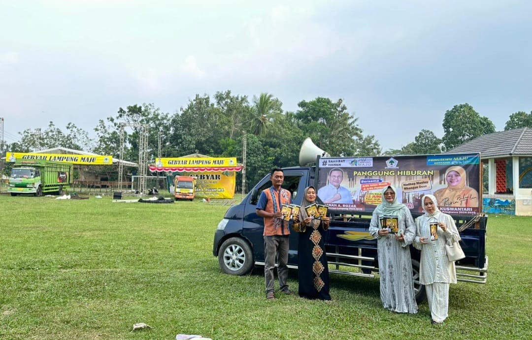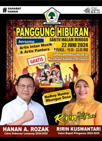 “Assalammualaikum, pripun kabare, Kami ingin mengajak seluruh Masyarakat di Kabupaten Pringsewu, khususnya diseputaran Kecamatan Sukoharjo, Adiluwih dan Gading Rejo untuk sama-sama kita bergembira menikmati hiburan gratis, konser musik Gebyar Lampung Maju yang diselenggarakan oleh Pak Hanan sebagai calon Gubernur Lampung dan Mbak Ririn sebagai Calon Bupati Kabupaten Pringsewu”, kata Ririn yang merupakan anggota DPRD Provinsi Lampung dari daerah pemilihan Pringsewu, Pesawaran, dan Metro pada Jumat (21/6/2024)