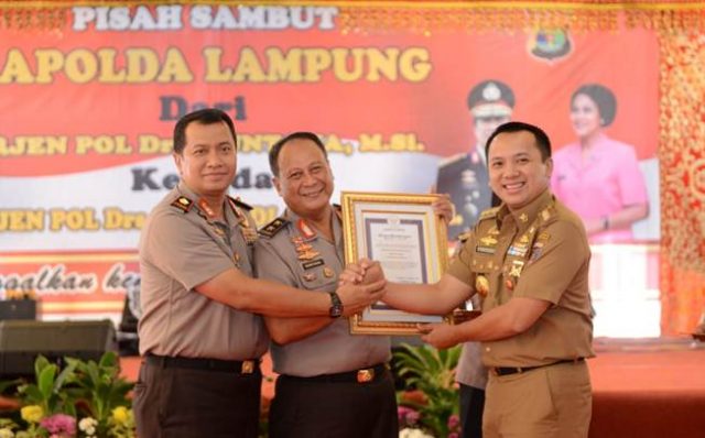 Gubernur Ridho juga memberikan cinderamata surat piagam penghargaan kepada Irjen Pol Drs. Suntana, M.Si atas pengabdian dan kerjasama yang baik dalam menjalankan tugas sebagai Kapolda Lampung.