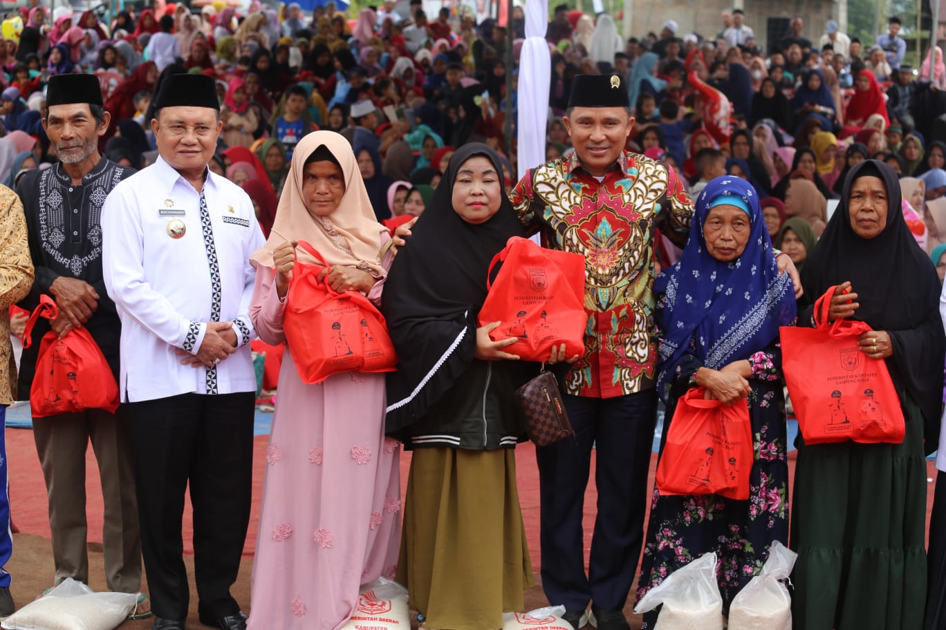 Penyerahan bantuan itu pun disaksikan langsung oleh Ketua Baitul Mukhlisin Kabupaten Lampung Barat Partinia Parosil Mabsus, Assisten bidang administrasi umum Drs. Ismet Inoni, Camat Batu Ketulis, Bhabinsa, Bhabinkamtibmas, para Peratin serta ribuan jamaah yang hadir.