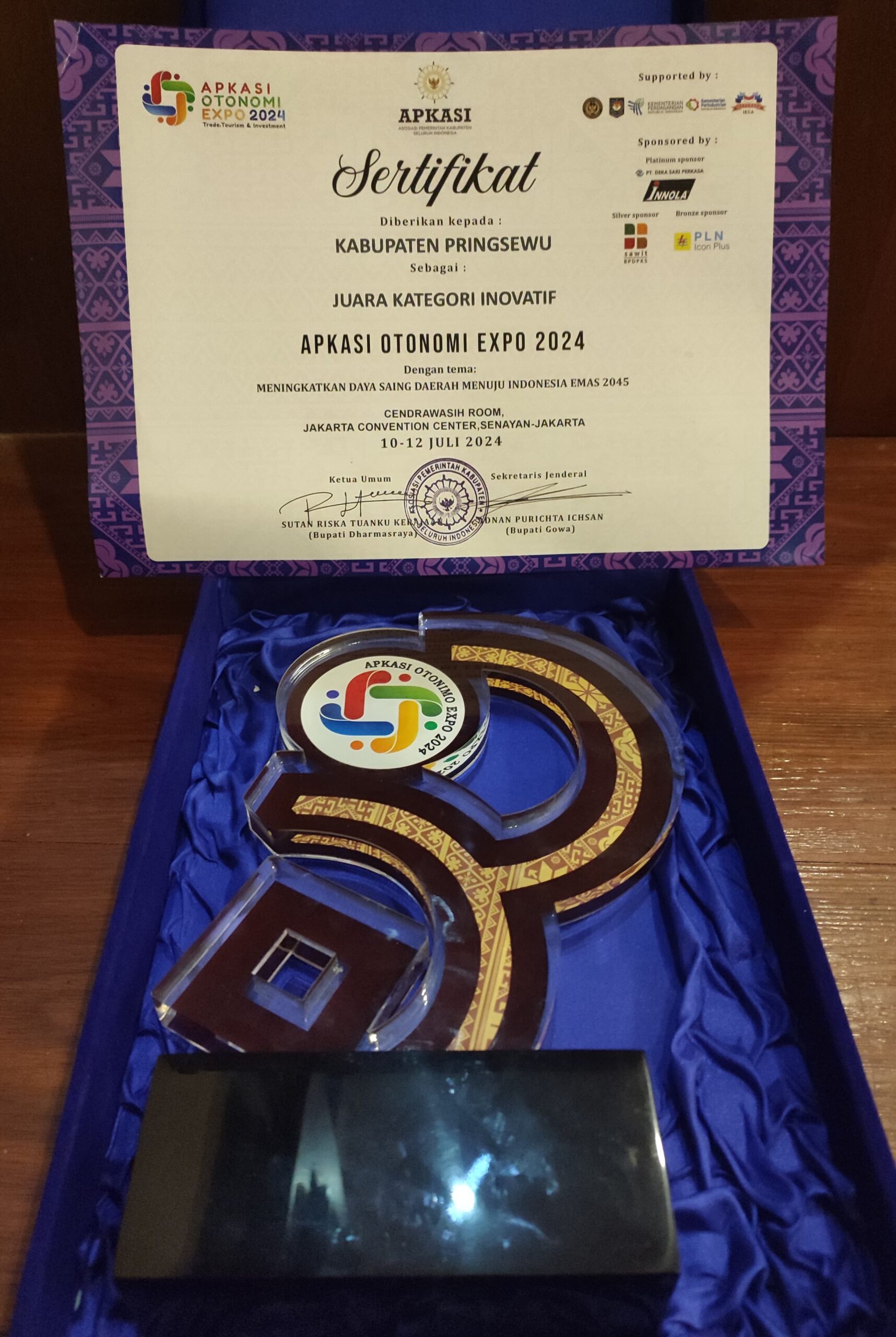 Jakarta, Penacakrawala.id – Kabupaten Pringsewu dengan bangga mengumumkan bahwa mereka telah meraih Penghargaan Kategori Inovatif dalam gelaran APKASI Otonomi Expo 2024 yang berlangsung di Jakarta Convention Center (JCC), Senayan, Jakarta, 13/07/2024, Penghargaan ini merupakan pengakuan atas dedikasi dan inovasi dalam meningkatkan pelayanan dan kemajuan di tingkat lokal.