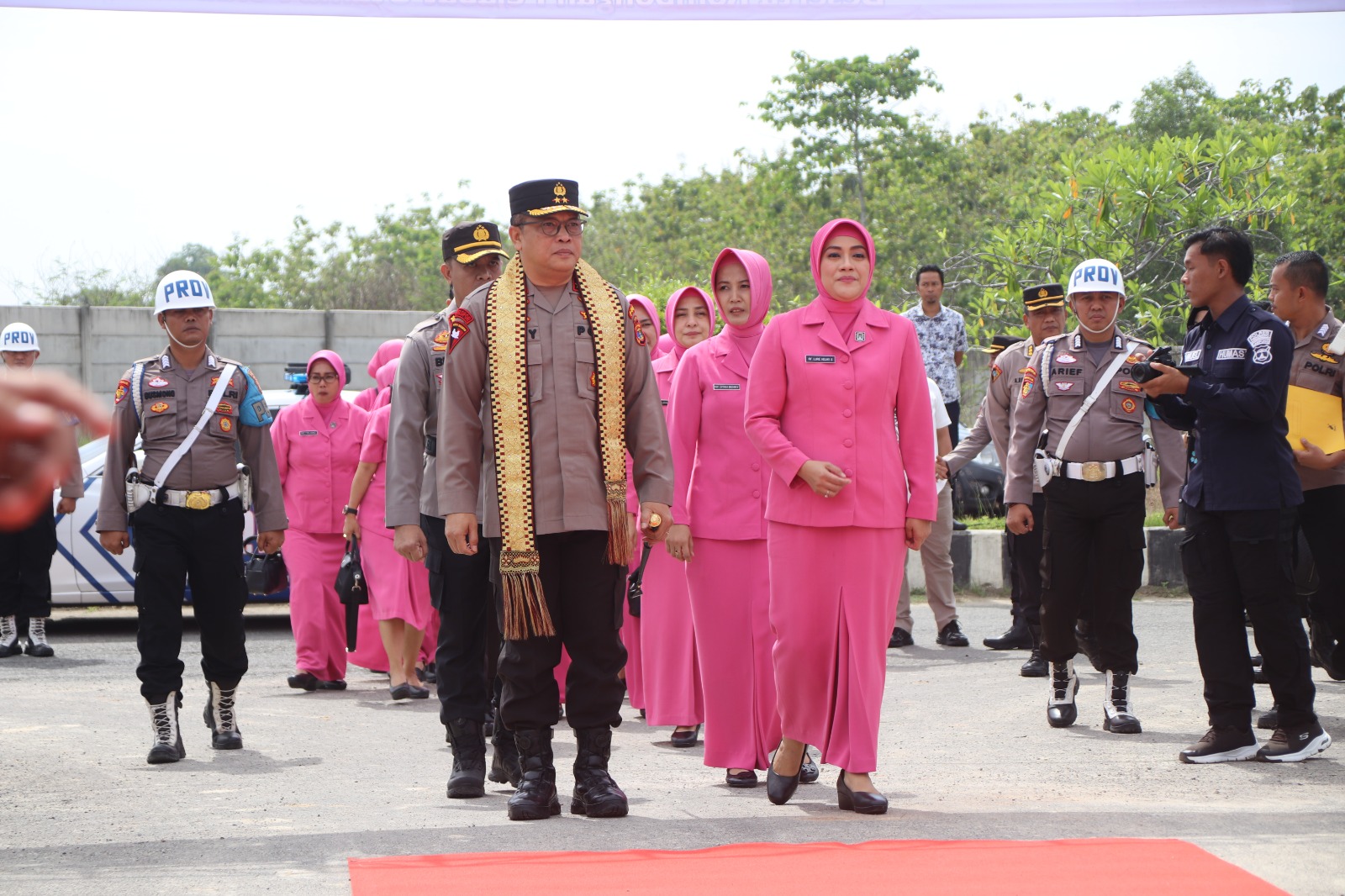 Dalam suasana yang meriah, Kapolda Lampung menerima pengalungan tapis dari perwakilan Polisi cilik binaan Polres Pringsewu, serta menikmati persembahan tarian Sigeh pengunten dari sanggar tari SMAN 1 Gadingrejo.