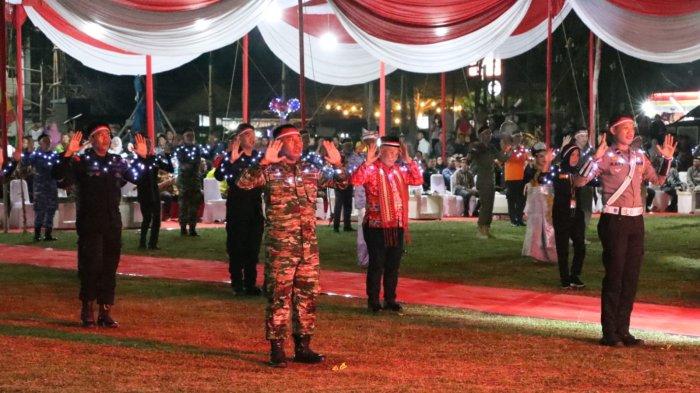 Pertunjukan tari kolosal kebangsaaan hadir dalam kegiatan deklarasi damai, doa bersama dan panggung budaya di Lapangan Ethanol, Kampung Tunggal Warga, Kecamatan Banjar Agung, Kabupaten Tulangbawang, Sabtu (5/10/2024) malam.
