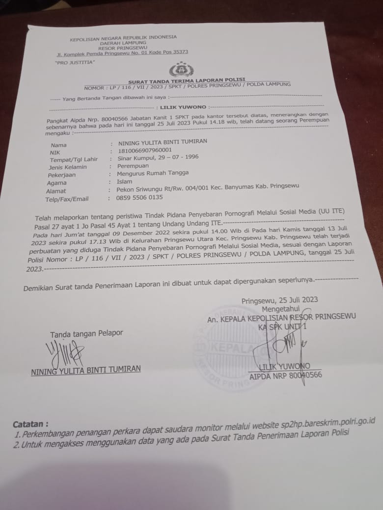 Laporan di terima SPKT Polres Pringsewu AIPDA NRP 80040566 Lilik Yuwono dengan Laporan Polisi Nomor : LP /116/ V11/ 2023/ SPKT/POLRES PRINGSEWU/POLDA LAMPUNG,