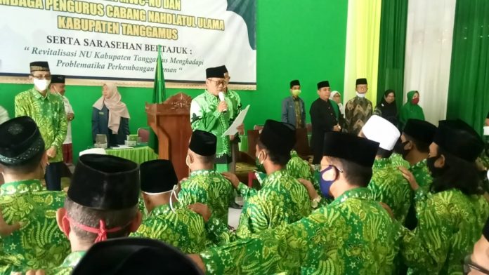 Tanggamus, Penacakrawala.com – Pengurus Cabang Nahdatul Ulama (PC NU) Kabupaten Tanggamus menggelar pelantikan dan pangukuhan Majelis Wakil Cabang (MWC) NU dan Lembaga Pengurus Cabang Nahdlatul Ulama Kabupaten Tanggamus, serta saraserahan bertajuk “Revitalisasi NU Kabupaten Tanggamus Menghadapi Problematika Perkembangan Zaman”. Kamis, 20 Agustus 2020.
