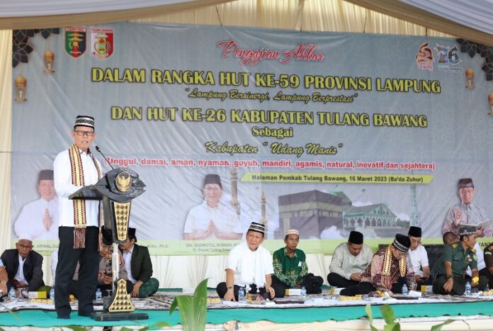 Tulang Bawang, Penacakrawala.com – Memperingati hari jadi Provinsi Lampung ke-59 dan hari jadi Kabupaten Tulang Bawang ke-26, Pemerintah Provinsi Lampung mengadakan Pengajian Akbar (Istighosah) di Lingkungan Pemkab Tulang Bawang, Menggala, Kamis (16/3/2023).