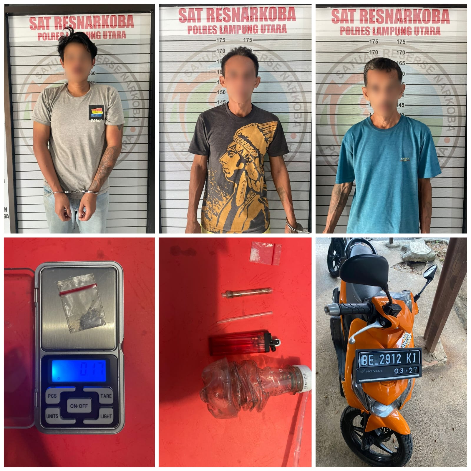 Kasat Narkoba Polres Lampung Utara AKP Made Indra Jaya mewakili Kapolres AKBP Teddy Rachesna, Selasa (22/8/2023), mengatakan ketiga tersangka ditangkap diduga karena kasus penyalah guna narkoba dan penangkapan itu dilakukan setelah pihaknya mendapatkan informasi di rumah salah seorang tersangka berinisial DB, kerap dijadikan tempat transaksi narkoba jenis sabu-sabu.