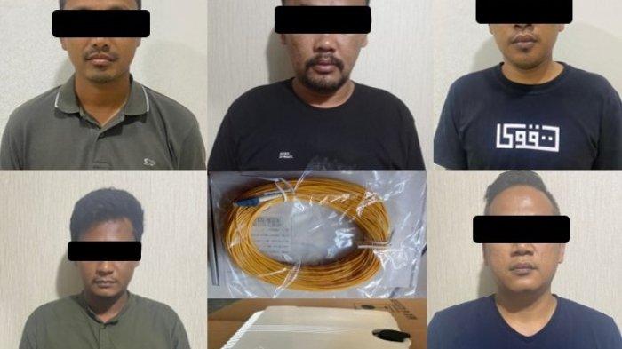 Kelima tersangka berinisial ARS, YB, PS, KW dan SW yang ditangkap jajaran Polda Lampung karena terbukti melakukan tindak pidana bekaitan dengan telekomunikasi.