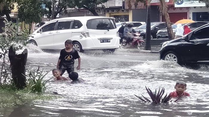 Sebagian besar wilayah Palembang terendam banjir, mulai dari jalanan hingga pemukiman warga.
