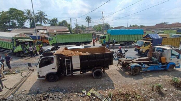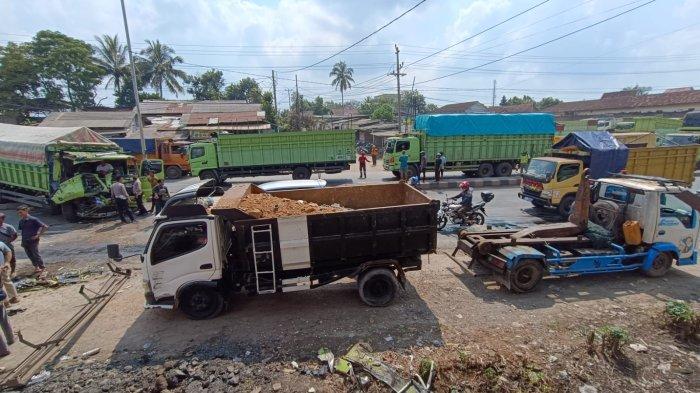 Ia mengatakan, dua mobil truk tersebut yang bermuatan tanah tersebut ditabrak oleh truk hijau.