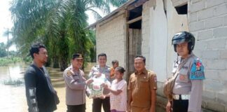 Mesuji, Penacakrawala.com - Kapolsek Way Serdang, Polres Mesuji, menyalurkan beras hingga minyak goreng untuk korban banjir.