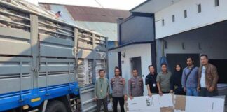 Pesisir Barat, Penacakrawala.com - Polres Pesisir Barat Polda Lampung melaksanakan pengamanan kedatangan logistik Pemilu 2024 di Gudang logistik KPU setempat.