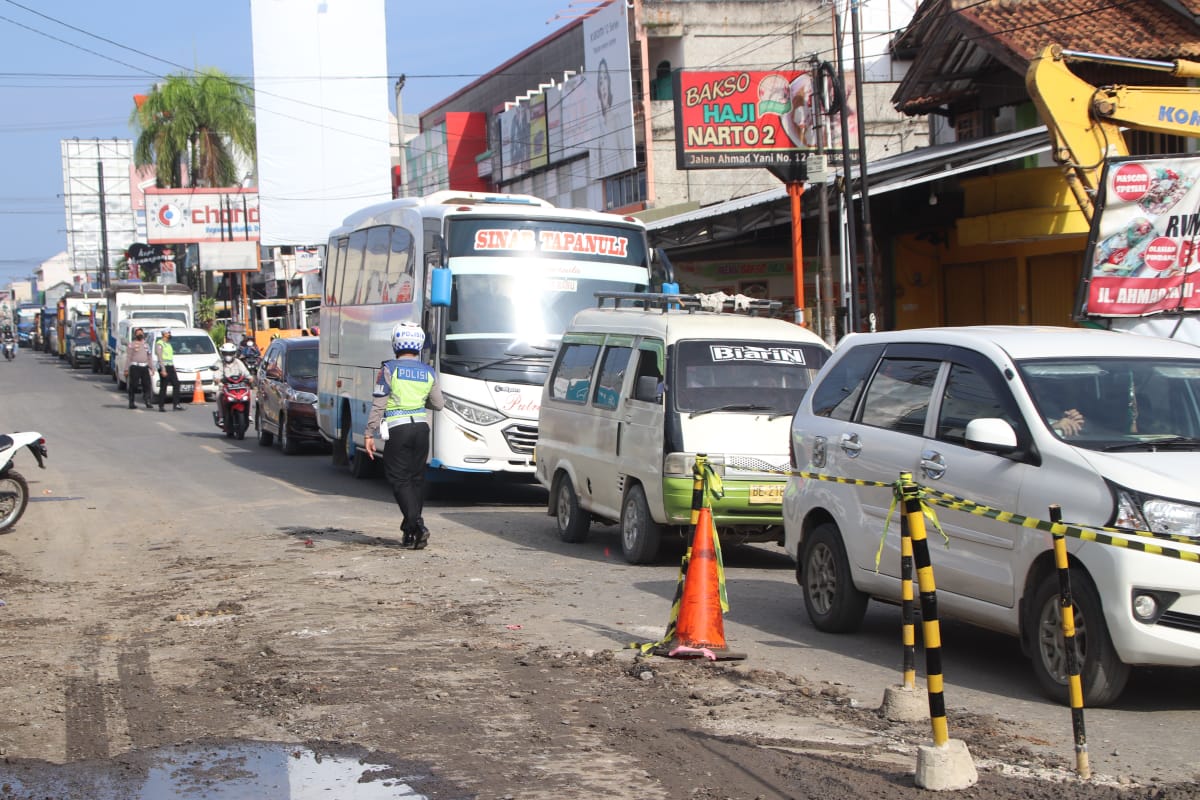 “Untuk mengurai kemacetan kami melalukan rekayasa lalu lintas dengan menerapkan sistem buka tutup,” jelasnya mewakili Kapolres Pringsewu AKBP Rio Cahyowidi
