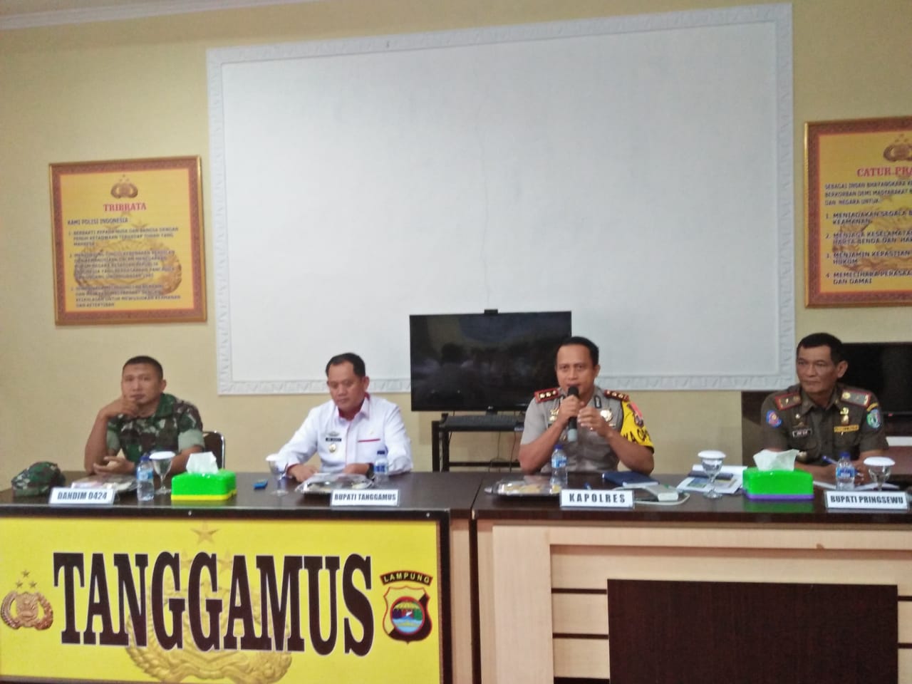 Kapolres Tanggamus AKBP I Made Rasma, didampingi Wakil Bupati Tanggamus Hi. AM. Syafii serta Kasdim 0424 Tanggamus Mayor Inf Suhada Erwin menerangkan. Sebelum rapat koordinasi dilakukan lebih dulu dilakukan telekonfrence mendengarkan arahan dari Menkopolhukam, Kapolri, Panglima TNI serta jajaran kementrian terkait lainnya dalam rangka menghadapi gelaran natal dan tahun baru. Berdasarkan arahan tersebut tentunya hal itu akan disesuaikan dengan tataran lokal yang ada diwilayah hukum Polres Tanggamus.