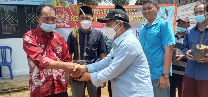 Penyerahan bibit buah-buahan di lakukan langsung oleh Alimin Abdullah Anggota DPR RI Fraksi PAN didampingi Hamidi Ketua DPD PAN Lampura dan Kades Peraduan Waras Marta Gunawan di halaman Kantor Desa setempat, Minggu, (9/1/2021).