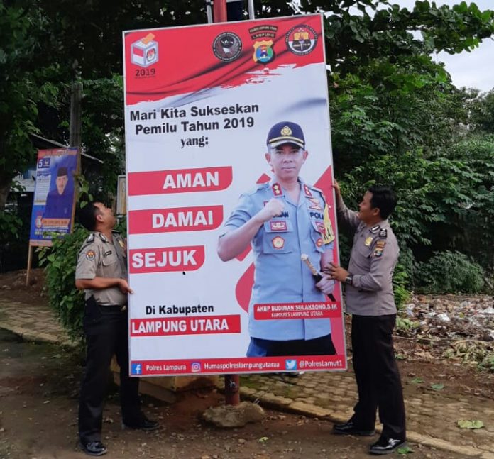 Lampung Utara, BITV – Dalam rangka mensukseskan Pemilu 2019 di Kabupaten Lampung Utara, Polres Lampung Utara menghimbau warga masyarakat untuk turut mewujudkan Pilpres dan Pileg 2019 yang aman, damai dan sejuk dengan memasang baliho himbauan kamtibmas di beberapa lokasi, Senin (14/1/19).
